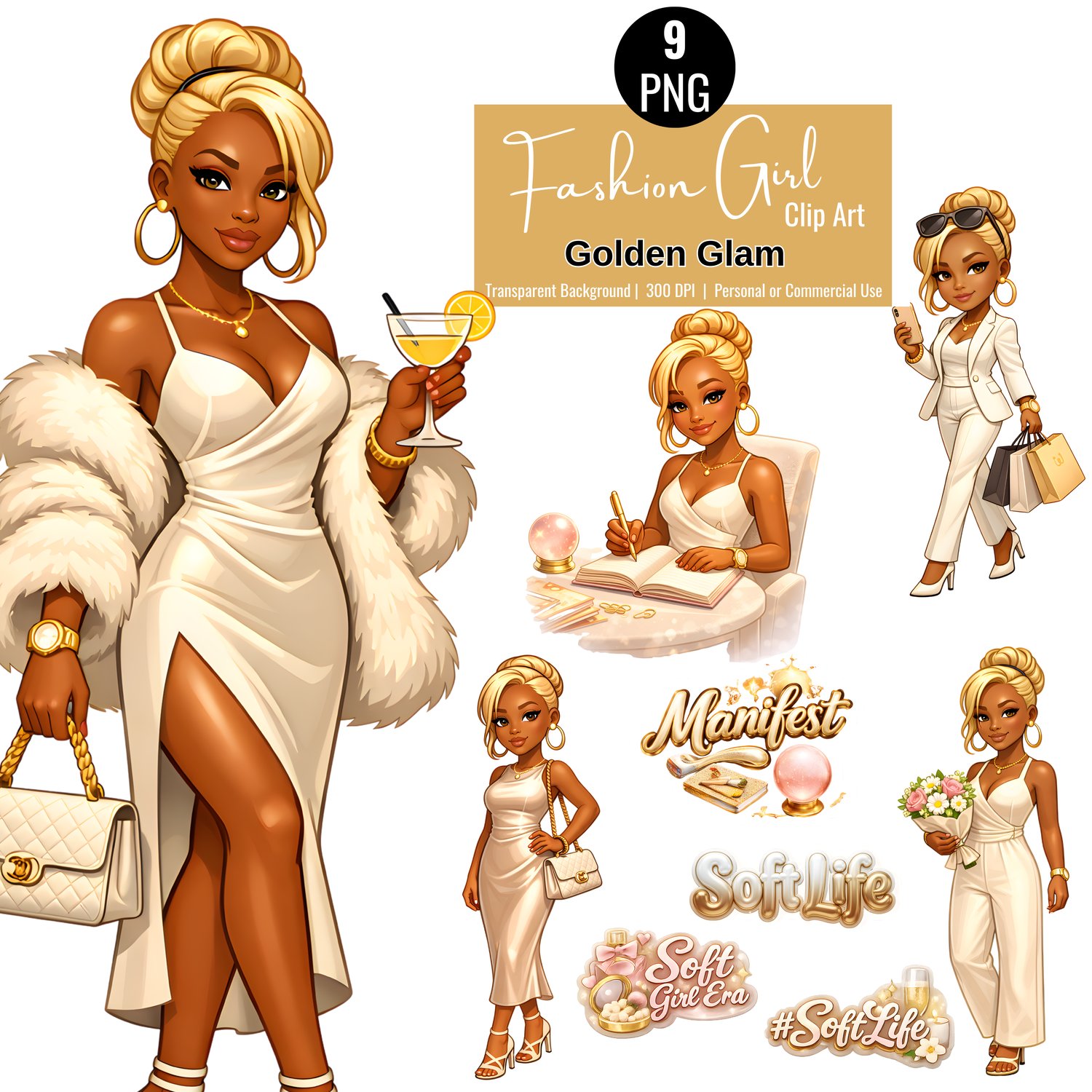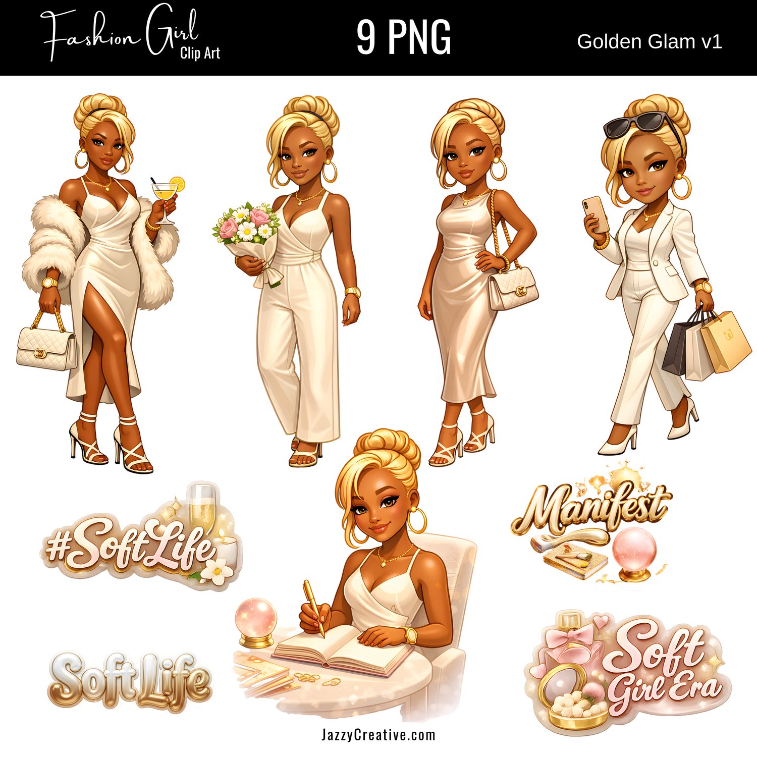 9 Fashion Girl Clip Art, Digital Stickers. Transparent background. (Golden Glam v1)